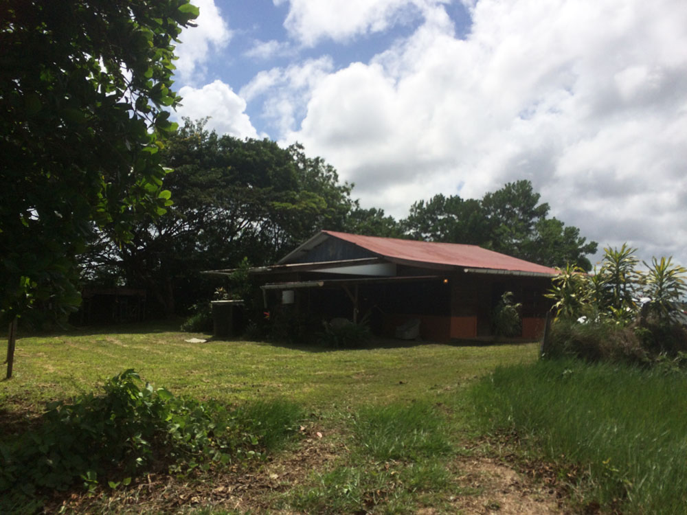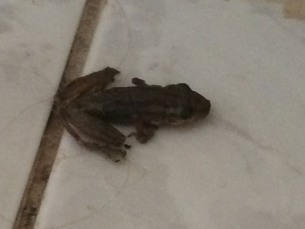 Nous avons loué une maison (airbnb) sur une exploitation agricole entre Cayenne et Kourou pour un prix très intéressant. La végétation est magnifique et puissante. Les petites bêtes aussi se sentent bien dans cette jolie maison en bois (et certainement dans le reste de la Guyane). Nous cohabitons avec des petites grenouilles noires et sauteuses,inoffensives mais quand même un peu flippantes lorsqu’elles nous sautent sur les pieds, elles adorent s’installer dans les climatisations. Les immenses  guêpes et araignées de la grandeur d’une main nous gênent un peu plus.  Le travailleur agricole, un surinamien qui vit avec sa femme et leurs 6 enfants dans une maison en bois sur pilotis un peu plus loin, vient chasser l’araignée et sprayer de poison les nids de guêpes.