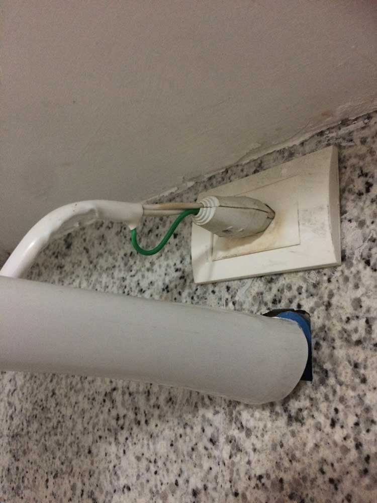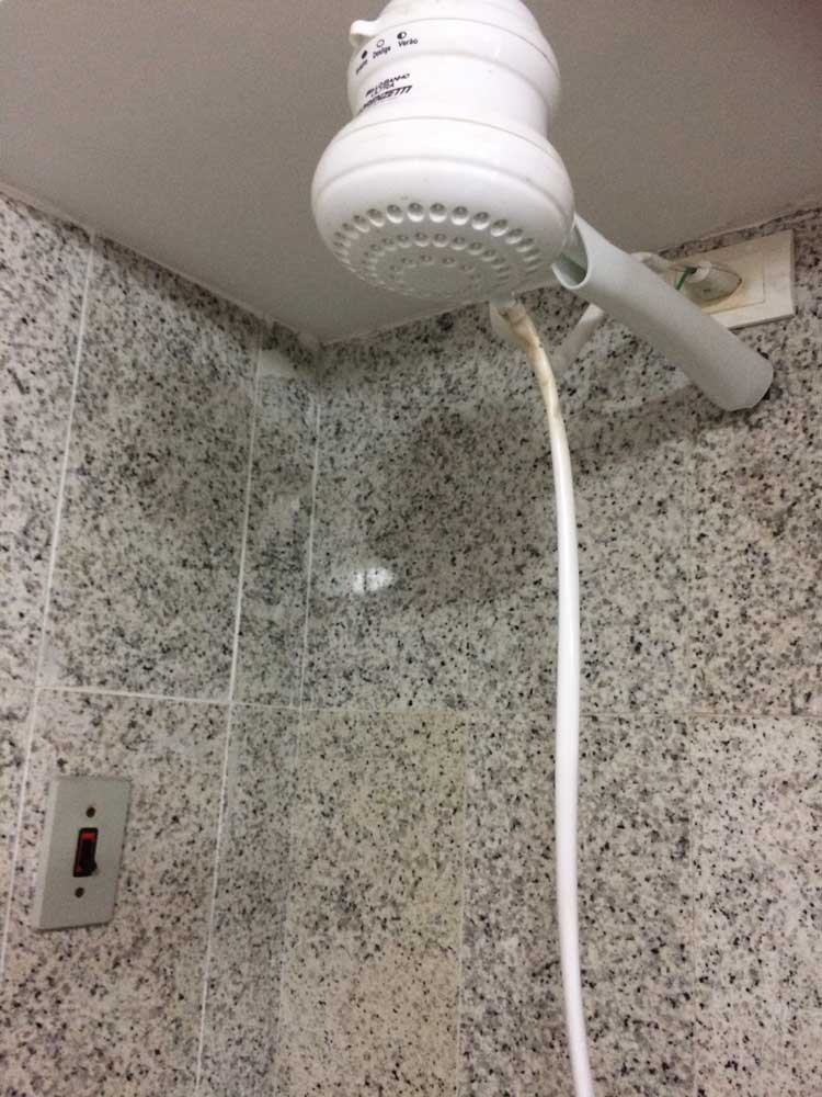 Les douches ont un système de chauffage d’eau électrique intégrés avec prise d’électricité dans la douche ! Et comme les électriciens ne sont pas trop regardant sur la qualité des raccords électriques (voir photo), ça semble plutôt dangereux dans l’ensemble. Dans la douche de ma chambre (voir la photo qui liste les 4 interdictions), il y a donc cette prise pour chauffer l’eau mais aussi un interrupteur pour allumer le plafonnier dans la douche et, a y être, une prise qui pourrait servir à… mystère. Tout va bien…