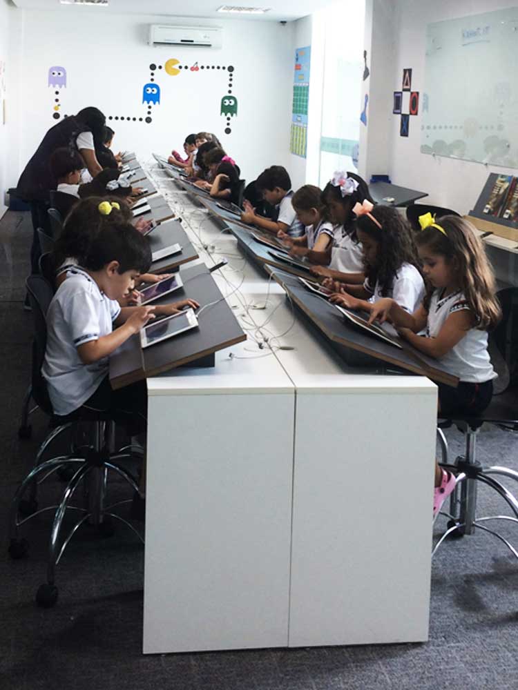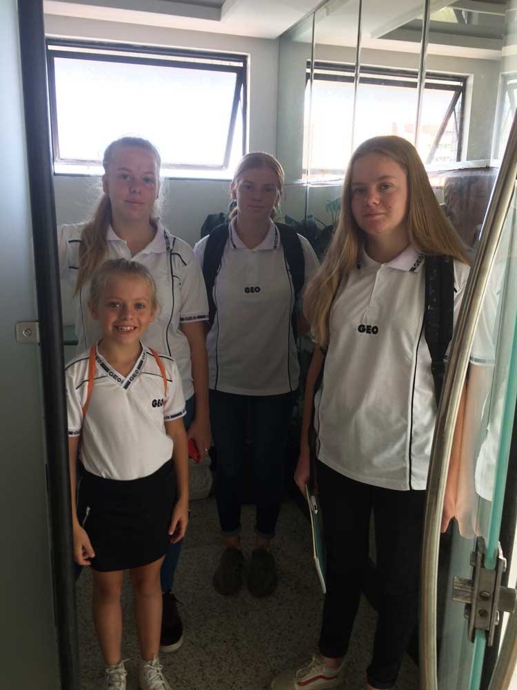 A GEO, comme ailleurs aussi, les classes sont chargées avec environ 40 élèves. Les tables sont plutôt petites avec une certaine promiscuité. L’air conditionné tourne en permanence et oblige les élèves à porter des sweat-shirts pour ne pas avoir froid. Les élèves restent dans la même classe pour la plupart des cours et ce sont les enseignants qui changent de classe d’heure en heure. Les cours pratiques d’informatique, de chimie, physique, sport ont lieu dans des salles spécifiques. Les contrôles se passent dans d’autres classe où les élèves sont disséminés.