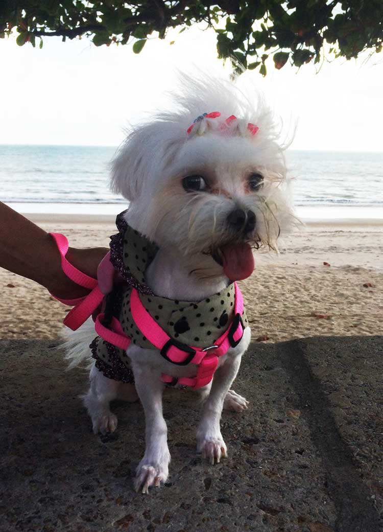Je suis étonnée par ces chiens qui ont dû passer des heures à être toilettés et qui se salissent en à peine une balade dans le sable et l’eau de mer ! Je suis également surprise de voir le soin extrême qui est donné à ces animaux, le temps que cela prend et le prix que cela coûte. Mais comment font-ils ?